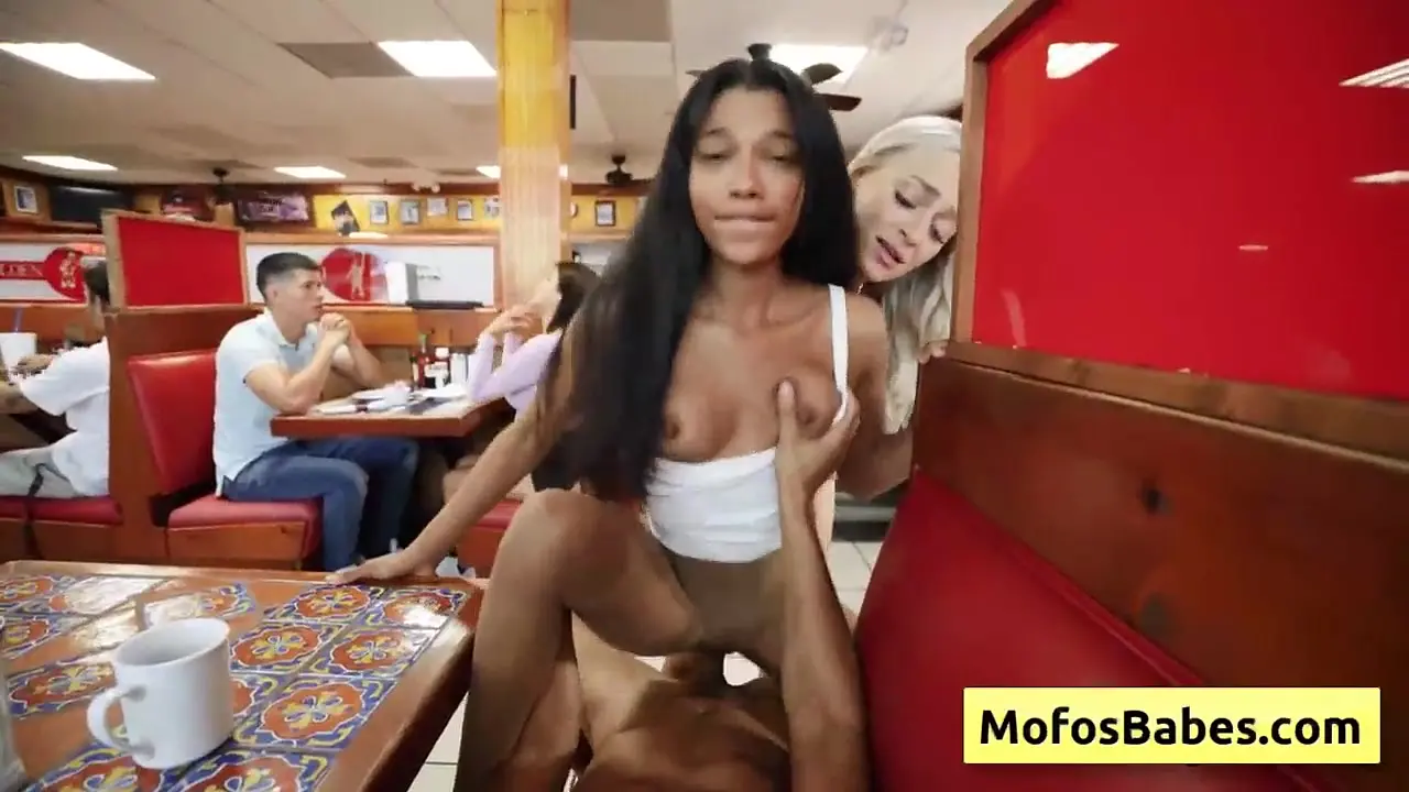 Two slutty and busty waitresses, Elana Bunnz and Eden West, take turns riding and fucking a lucky client, Derek Savage, in a public restaurant. He pounds their big tits and cums inside them. The other customers watch in shock as the girls scream with pleasure.