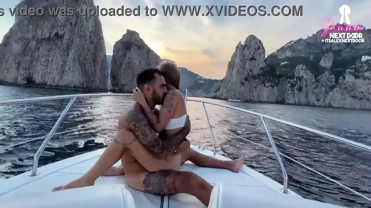 Fit and slim-bodied girlfriend gives a deepthroat blowjob to the captain in front of the crew. She bounces on his cock while wearing a bikini, and he makes her pussy clench with pleasure. The crew watches as she receives creampied on her toned body in public.