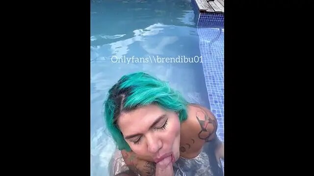 Latina babe gives blowjob in public pool