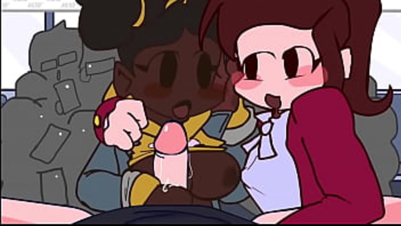 Animated parody of Friday Night Funkin' where a sexy girl bounces on cock in reverse cowgirl while her friend gets a handjob from another guy. They're in public and watch a nearby threesome. The girl cums on herself from jerking off at the end.