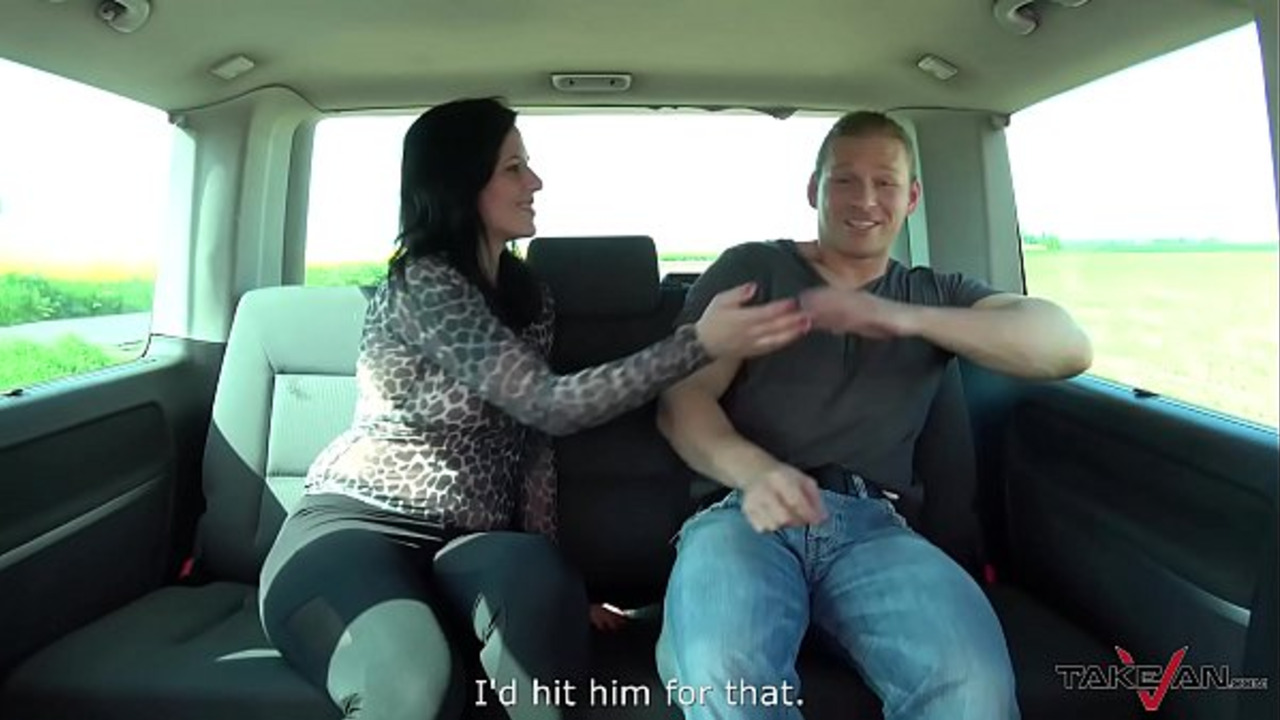 Brunette all natural sucks cock in a van