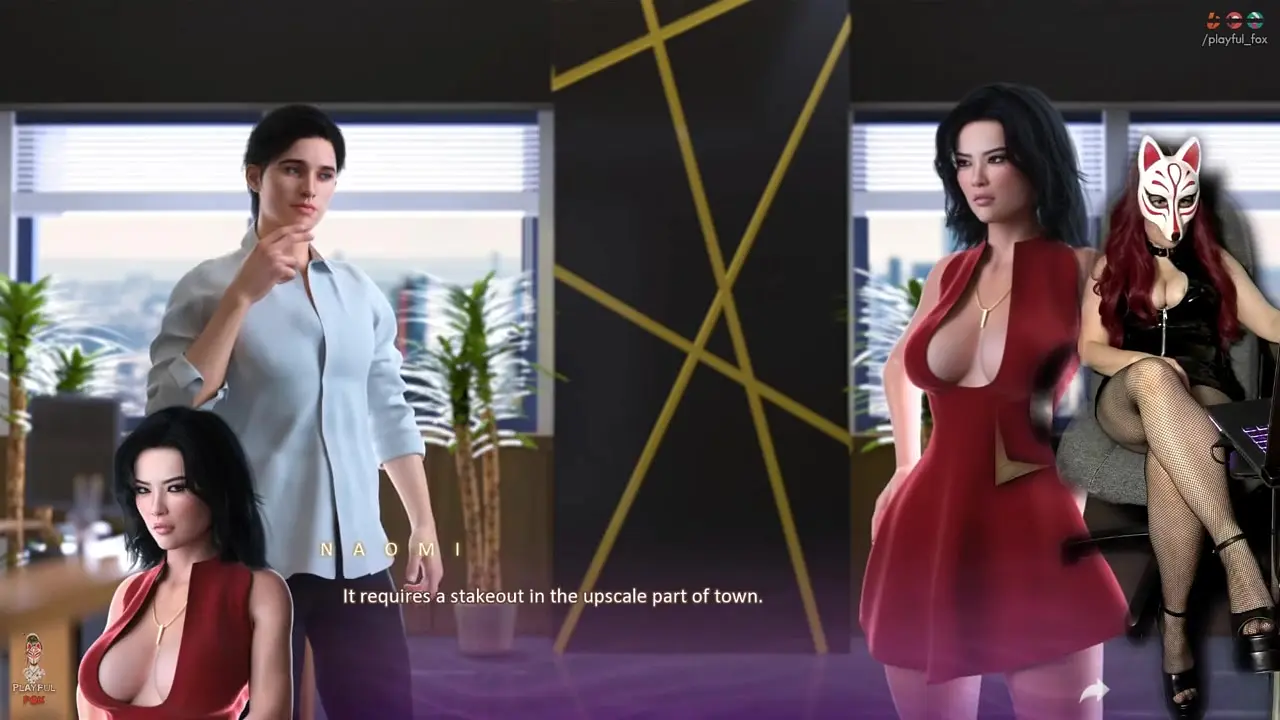 In this animated porn game, a busty milf cosplayer meets a lucky gamer at a college campus. She seduces him with her big tits and stocking-clad legs, and they play a sex game together. The visual novel-style playthrough features hot scenes of them fucking in various locations on campus.