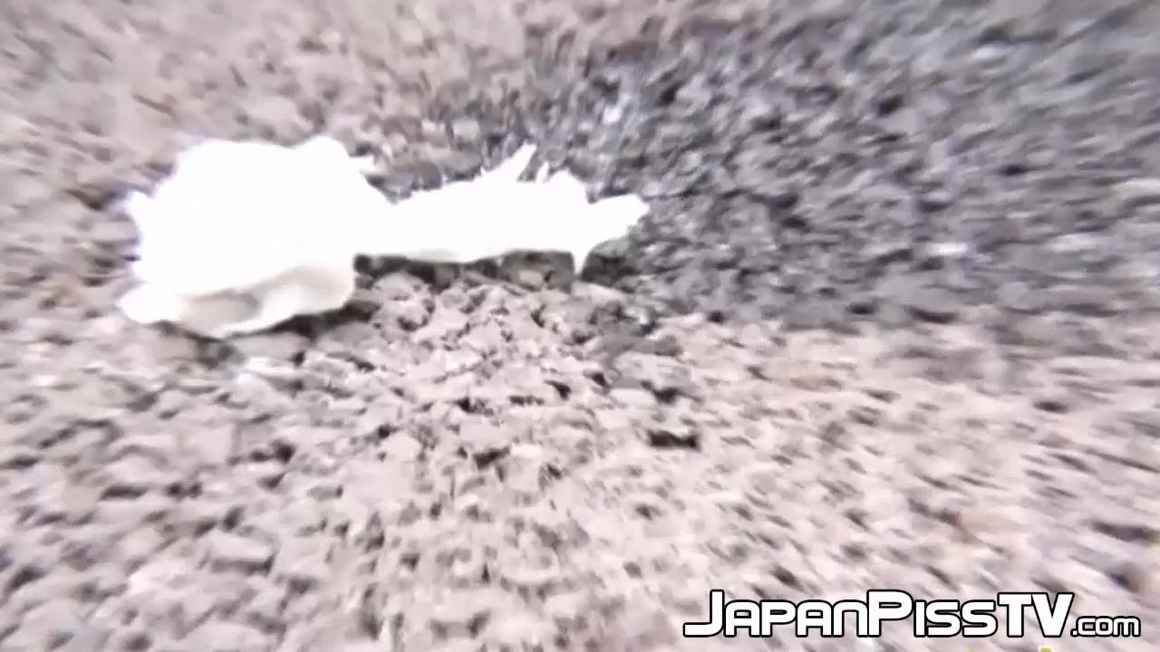 Sexy Asian brunette with a hairy pussy rushes to find a hidden spot to pee. She takes off her high heels and lingerie, revealing her cute panties. She squats down, peeing on the ground while a voyeur secretly watches.