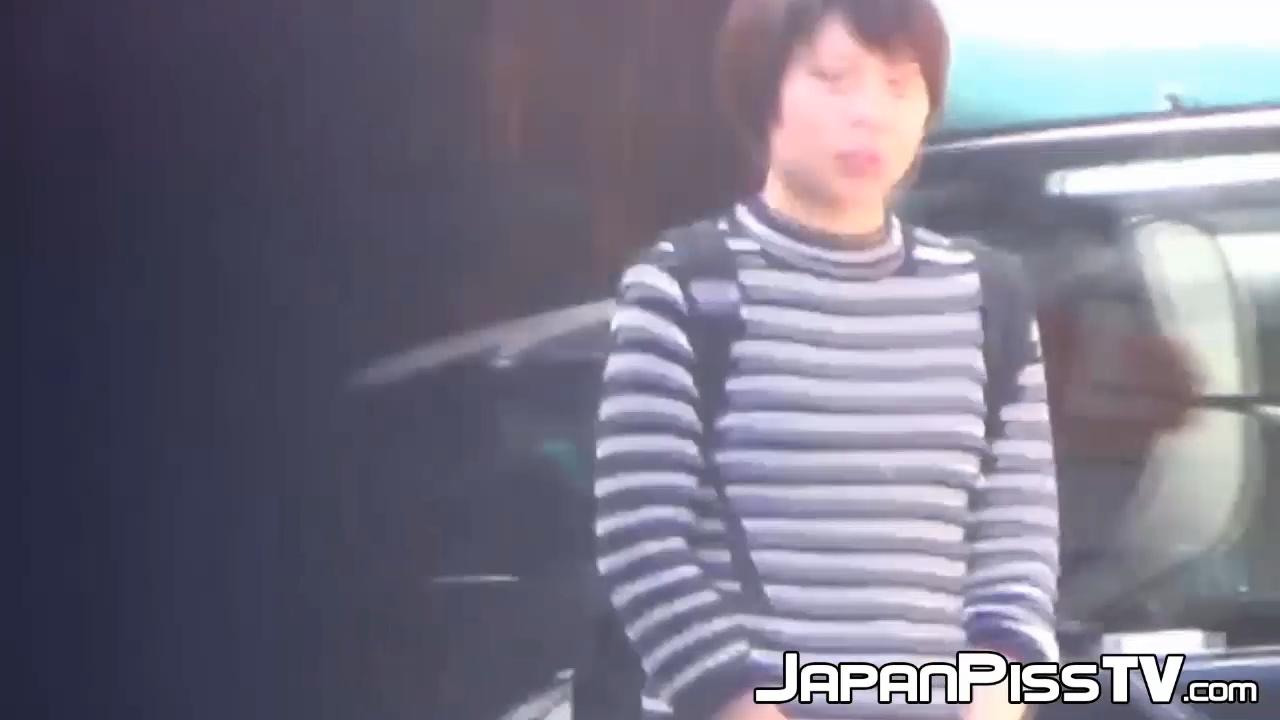 A dark-haired, beautiful Japanese babe stands in a public area, wearing only lingerie and kneehighs. She's caught on camera peeing, and her long furry bush gets soaked in the sexy stream of warm pee. Voyeurs love this fetish scene.