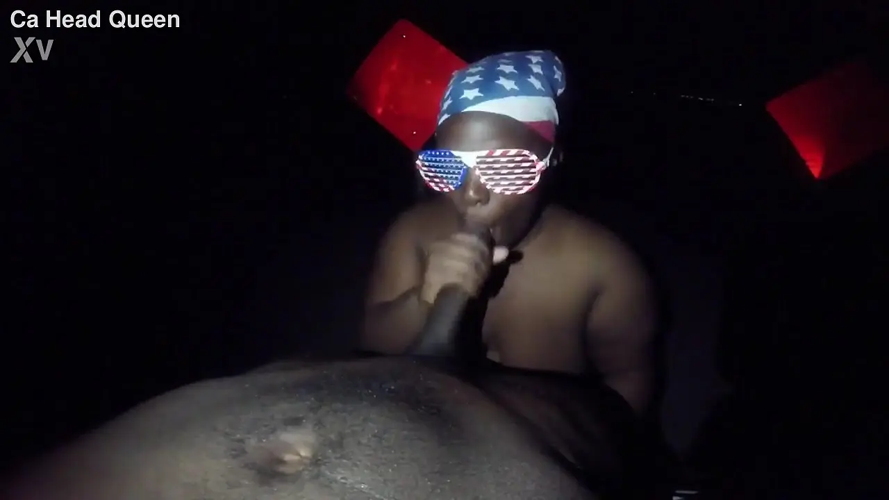 Curvy BBW gives a sloppy blowjob on a busy 4th of July street. The big black cock fills her mouth as she sucks him in public. She swallows his cum at the end.