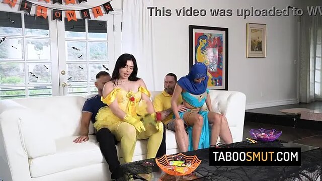 Halloween foursome: Two hot American teens give deepthroat blowjobs to hunks