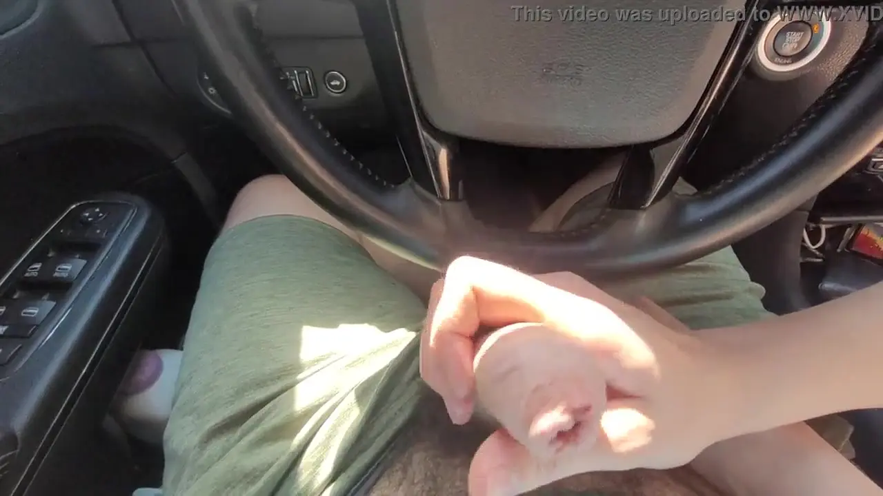 Attractive woman gives a handjob through a car window to a lucky guy. She takes his shaft in her hand and strokes it until he cums all over her fingers.