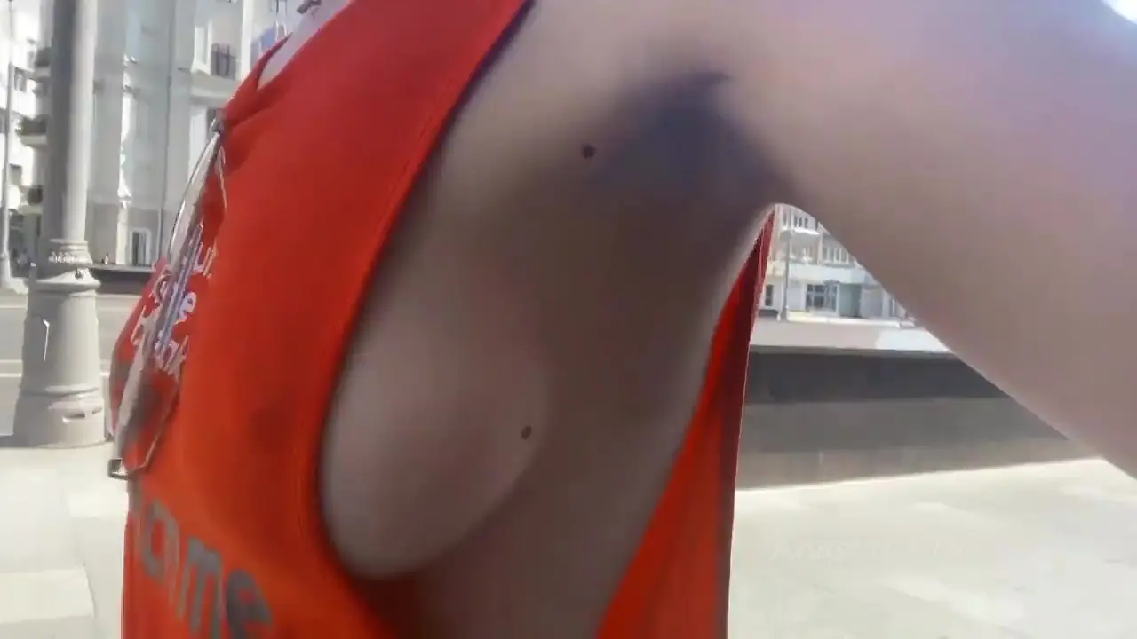 A young woman in a soaking top flashes her boobs in the city and gets noticed by a lucky guy who takes her home and fucks her. She rides his dick and he gives her a creampie.