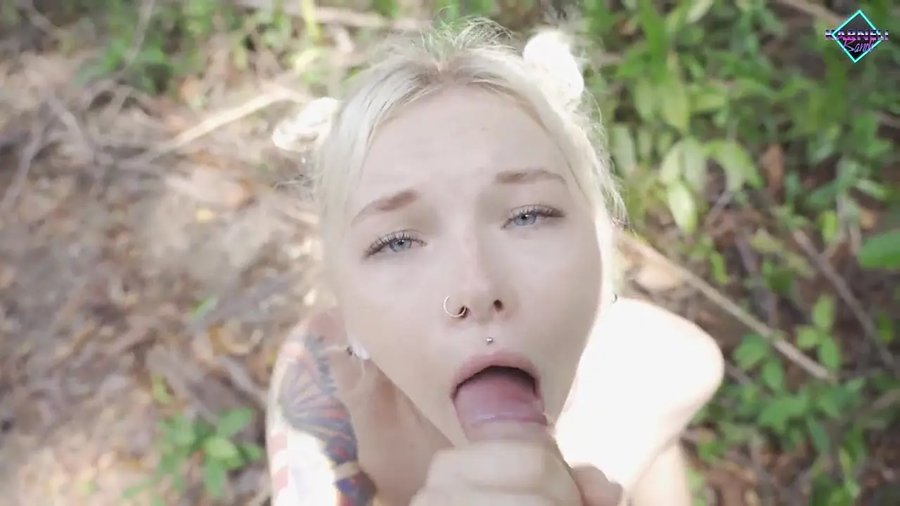 Cute blonde teen with a big rod tattoo gives a sloppy blowjob to her sexy boyfriend. She deepthroats him and takes all his inches, making him cum on her pretty face. They both enjoy the steamy moment in the woods.